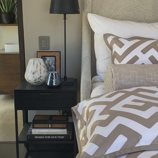Dette designet er inspirert av klassiske tekstiler fra Sør-Afrika, og finnes i flere varianter. I en verden fylt med farger, er det forfriskende med et monokromt design der mønsteret får spille hovedrollen. Den nye fargen i Pure Cashmere gir et sofistikert og tidløst preg. Kvaliteten i den myke bomullssatengen er fantastisk å sove i, og den oppredde sengen ser ut som en drøm. Et design som oser av klasse og eleganse, i ekte Halvor Bakke stil.