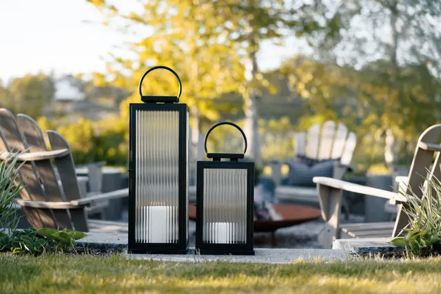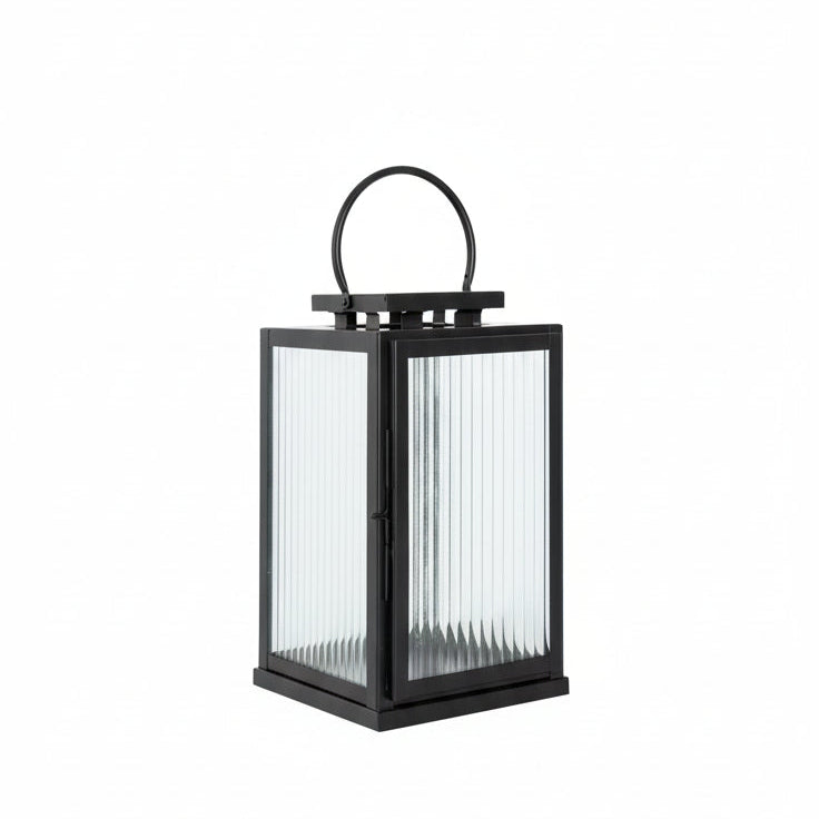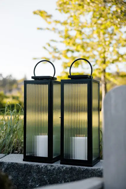 Nydelig lanterne fra Halvor Bakke i svart rustfritt metall med rillet glass. Lykten er kjempefin ute til alle årstider og passer like fint både på trappa, i hagen eller der du selv måtte ønske. Lanternen finnes også i større størrelse.