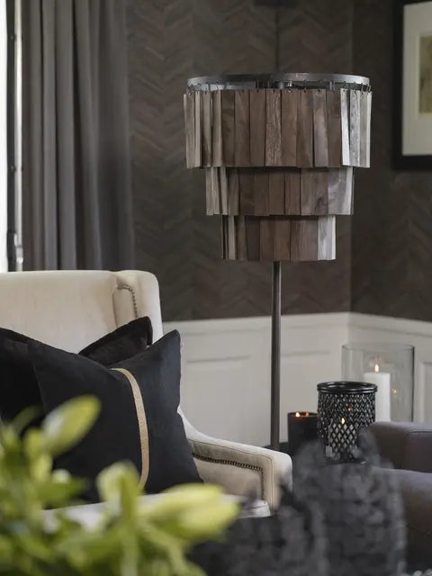 Gulvlampe med hengende trebiter i tre nivåer, i en rustikk brun finish.