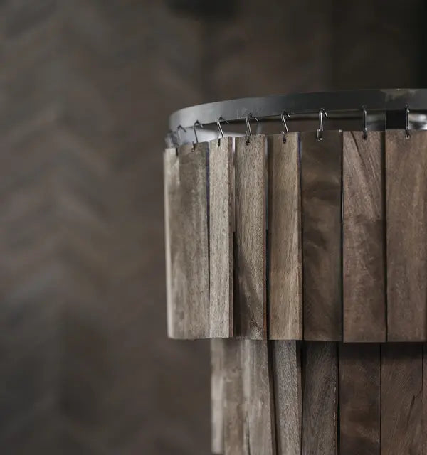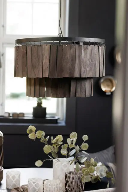 Taklampe med hengende trebiter i to nivåer, i en rustikk brun finish.