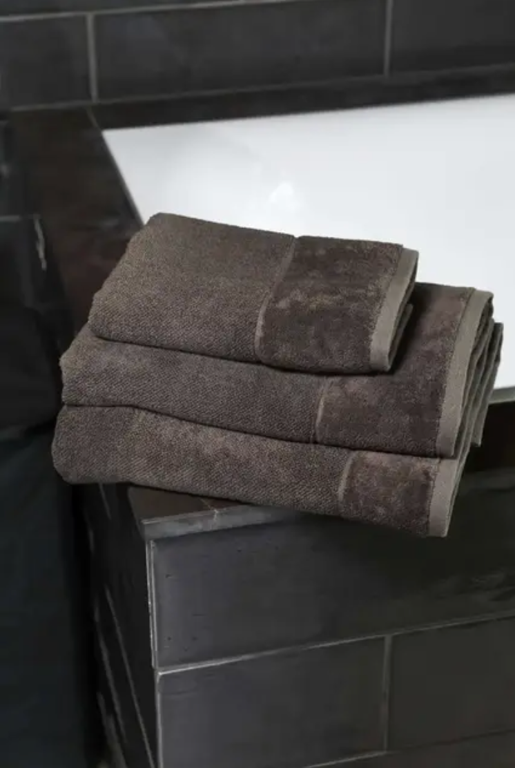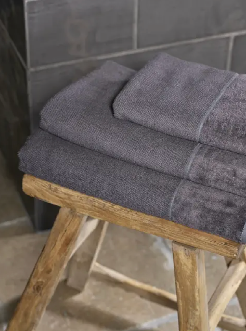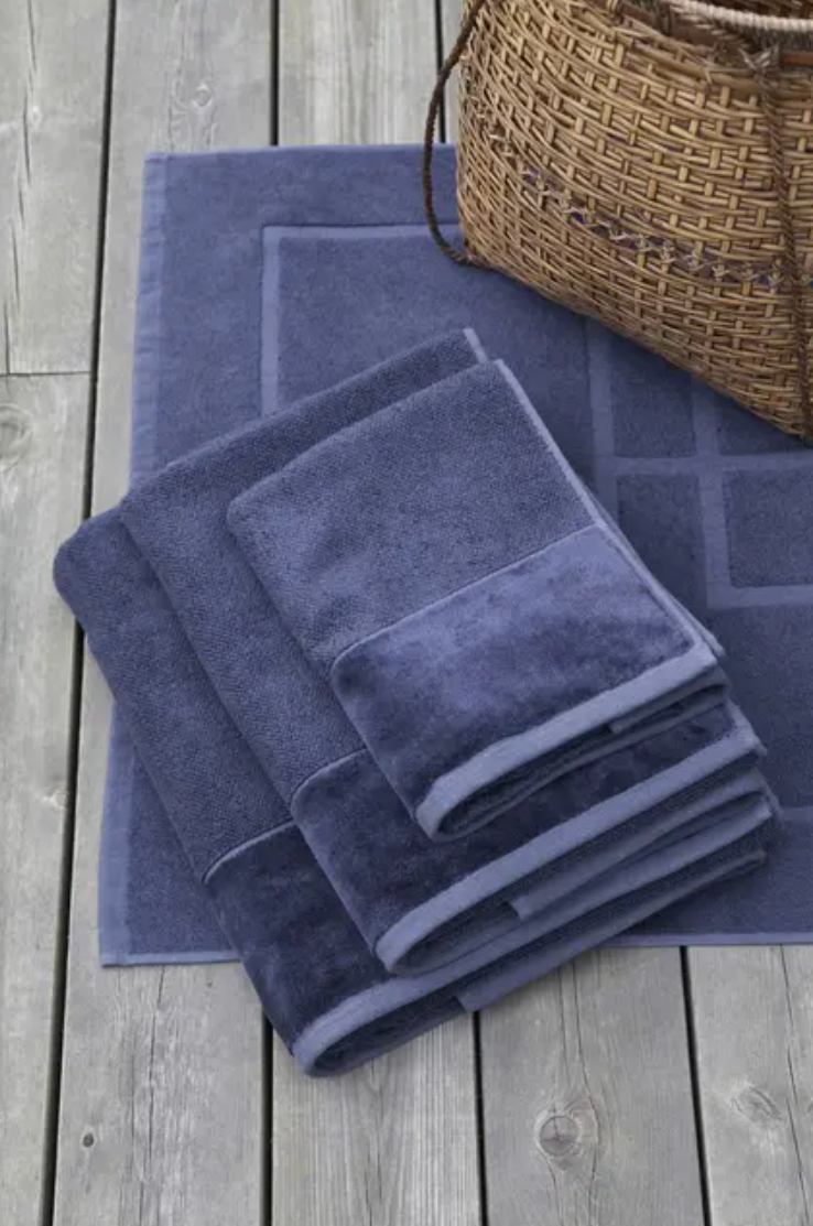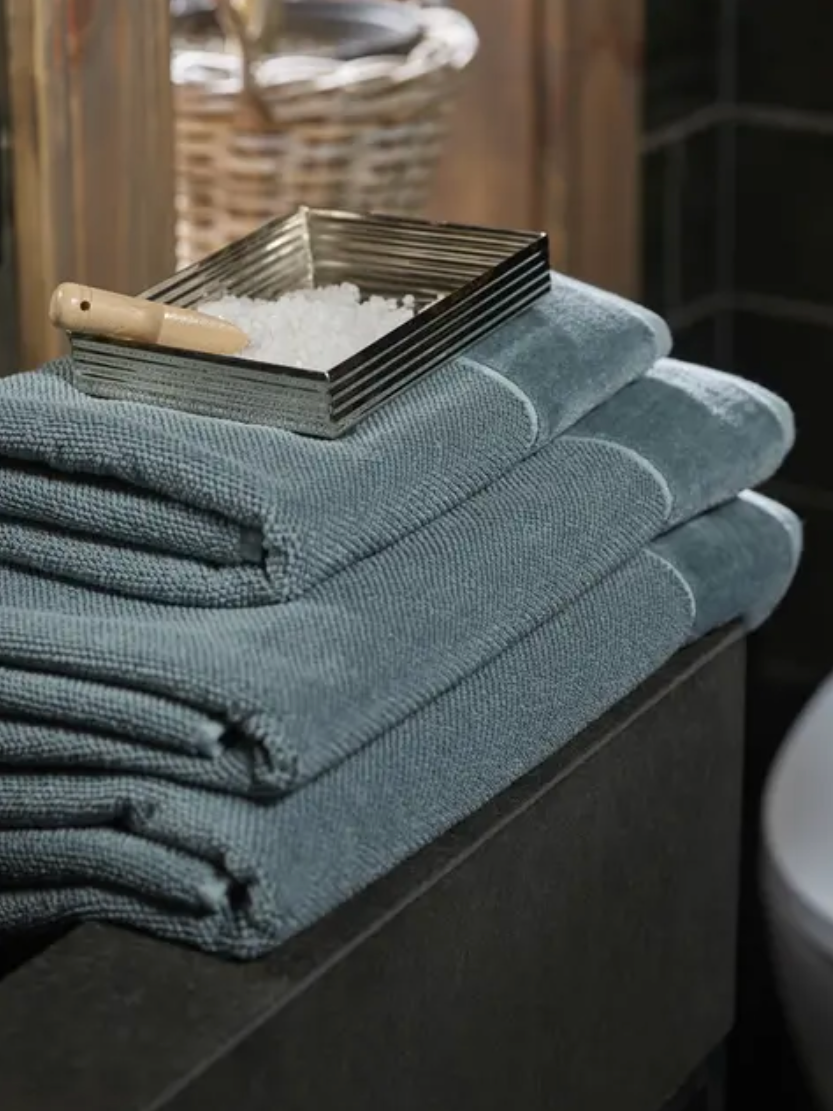 Nydelige håndklær i egyptisk bomull med vakker kant i viskosevelur i Halvor Bakkes vakre fargepalett. Baderommet er viktig for hverdagsluksusen, og det skal bugne av lekre håndklær i nydelige farger. Håndklærne har optimal tørkeevne og er myke mot huden, og tilfører baderommet det myke elementet. Det er tilhørende badematter i den samme lekre fargepaletten som håndklærne.