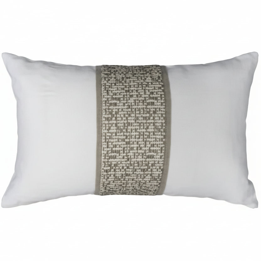 Putetrekk i hvit lin med en bred, kontrastfarget stripe med vevet tekstur. Den gylne stripen har en smal, beige stripe på hver side, noe som gir puten et elegant og tidløst preg. Et eksklusivt design signert Halvor Bakke, som setter et sofistikert preg på interiøret.