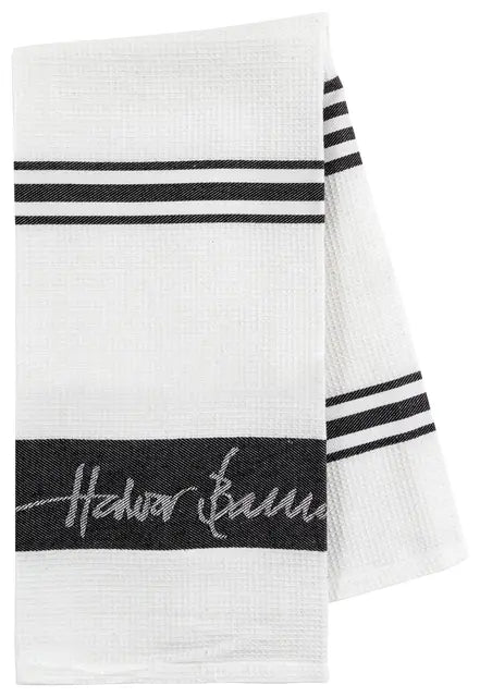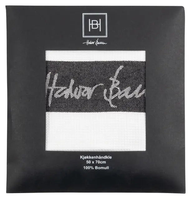 Kjøkkenhåndkle i bomull med klassisk stripedesign på hvit bunn og Halvor Bakke-logo i nederkant. Håndkleet har en dekorativ vaffeltekstur som også gir det en god oppsugingsevne, samt hempe til oppheng i hjørnet.