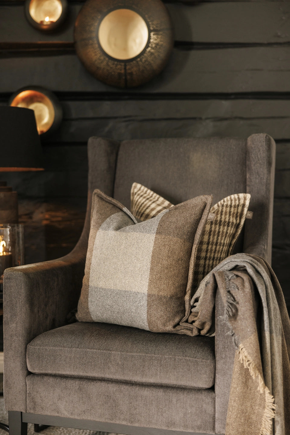 Herlig putetrekk i ull med store ruter i nyanser av brun, beige og grå. Ull er et pustende materiale, noe som gjør putetrekket behagelig året rundt. Trekket har en stilren finish som passer inn i ethvert rom.