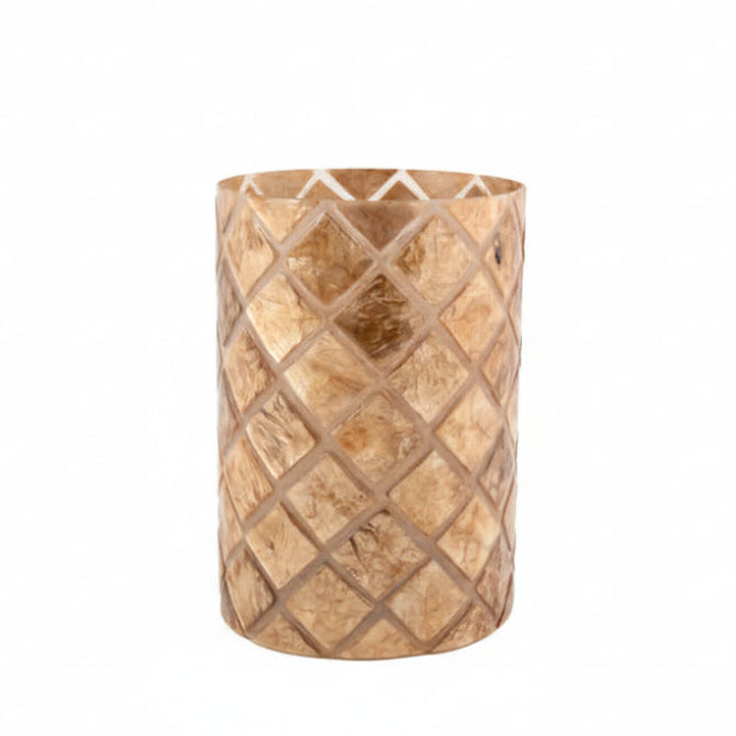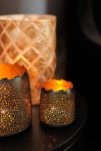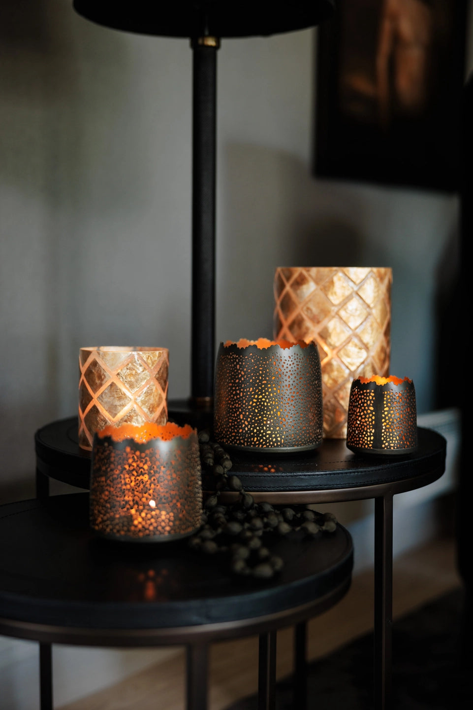 Lysholderen med capiz skjell i bronsefarget tone skaper en lun og stemningsfull atmosfære.