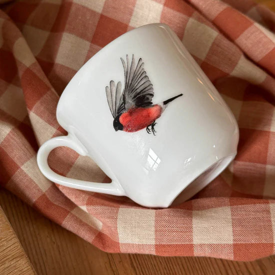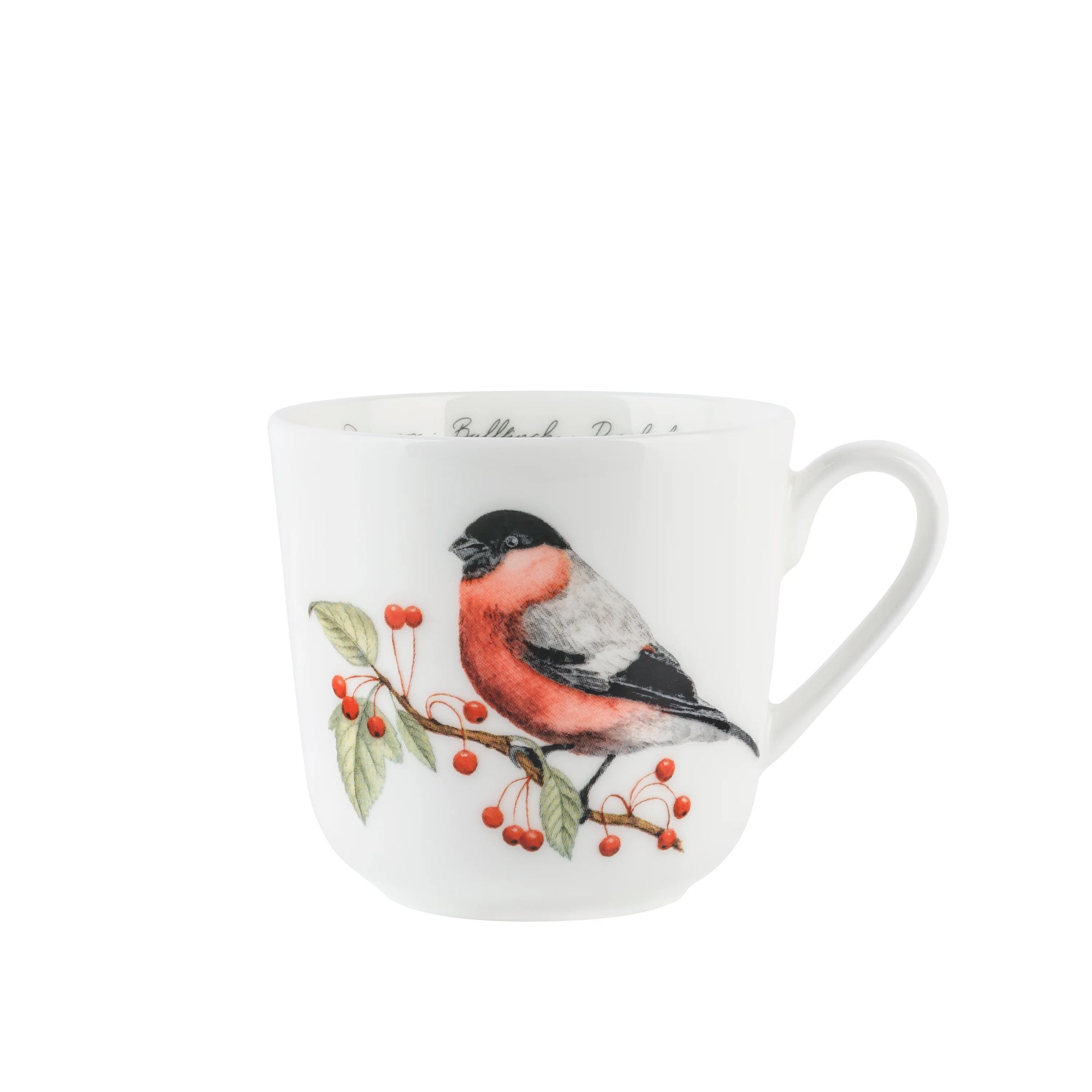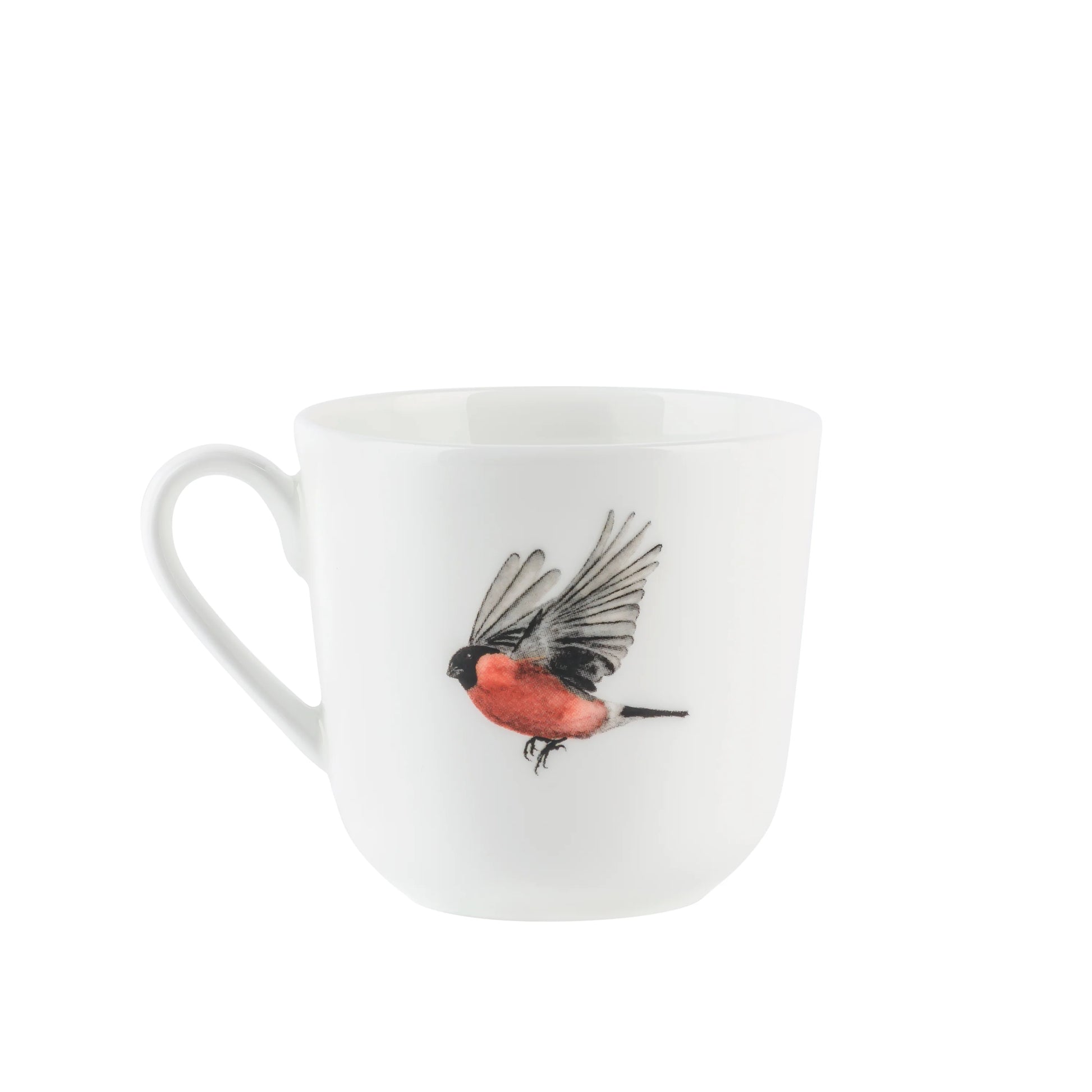 Nyt morgenkaffen med dette vakre kruset dekorert med dompapen, en av Norges mest kjente vinterfugler. Med sitt røde bryst og sorte hode er dompapen et sikkert tegn på vinter, og den bringer både farge og liv til ethvert fuglebrett, samt til ditt kaffebord. Kruset er laget i tynn, gjennomskinnelig benporselen, rommer 30 cl, og har fuglens navn på norsk, latinsk og engelsk inni.