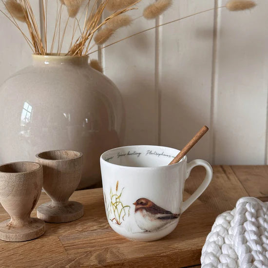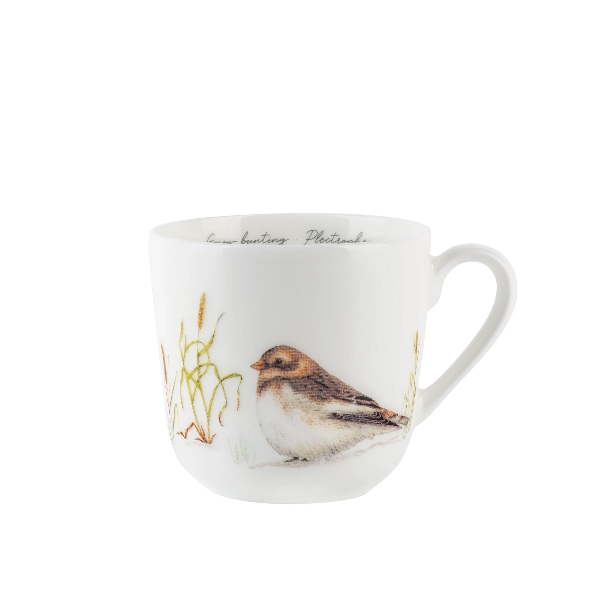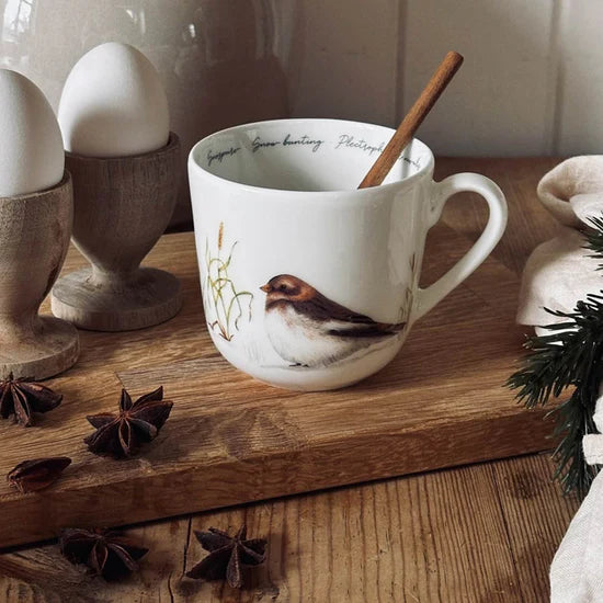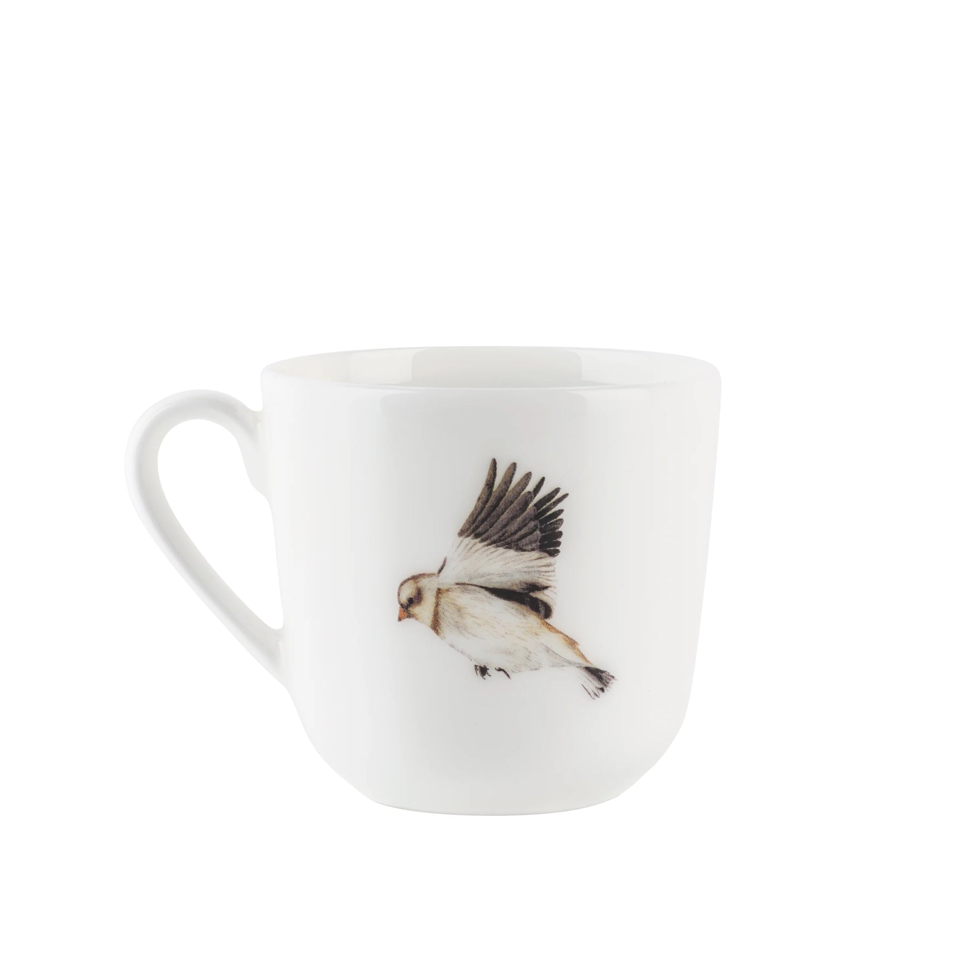 Start dagen med dette elegante kruset dekorert med snøspurven, en av Norges mest hardføre fugler. Med sin snøhvite fjærdrakt og svarte vingetupper, er snøspurven et symbol på arktisk skjønnhet. Kruset er laget av tynn, gjennomskinnelig benporselen, rommer 30 cl, og har fuglens navn på norsk, latinsk og engelsk inni.