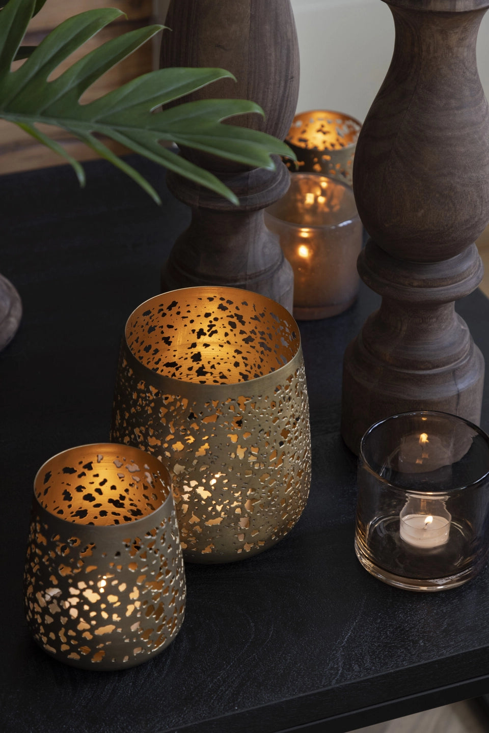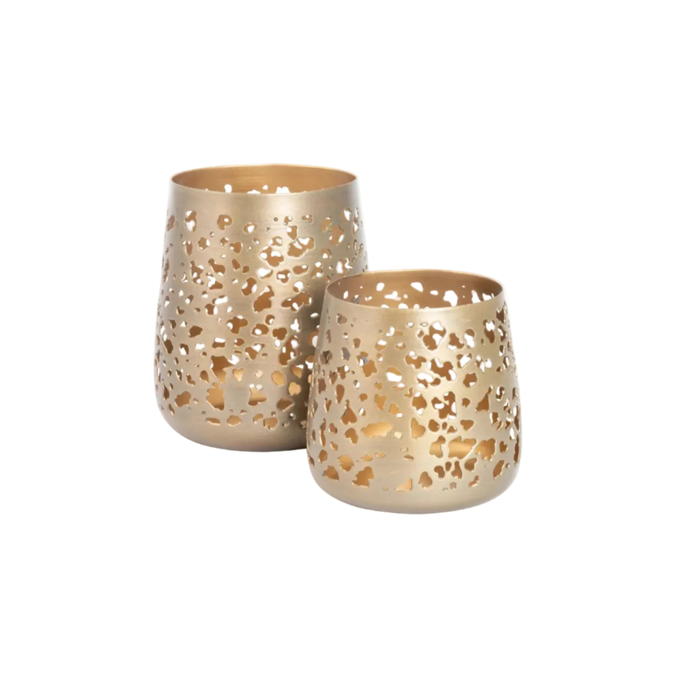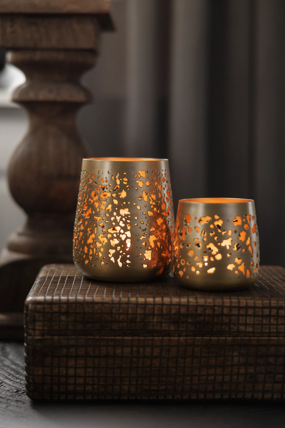 Lyslykt til telys i messingfarget metall med perforert mønster. Lykten gir et vakkert skinn fra de tente lysene, og den gylne innsiden gir lyset en ekstra lun følelse.