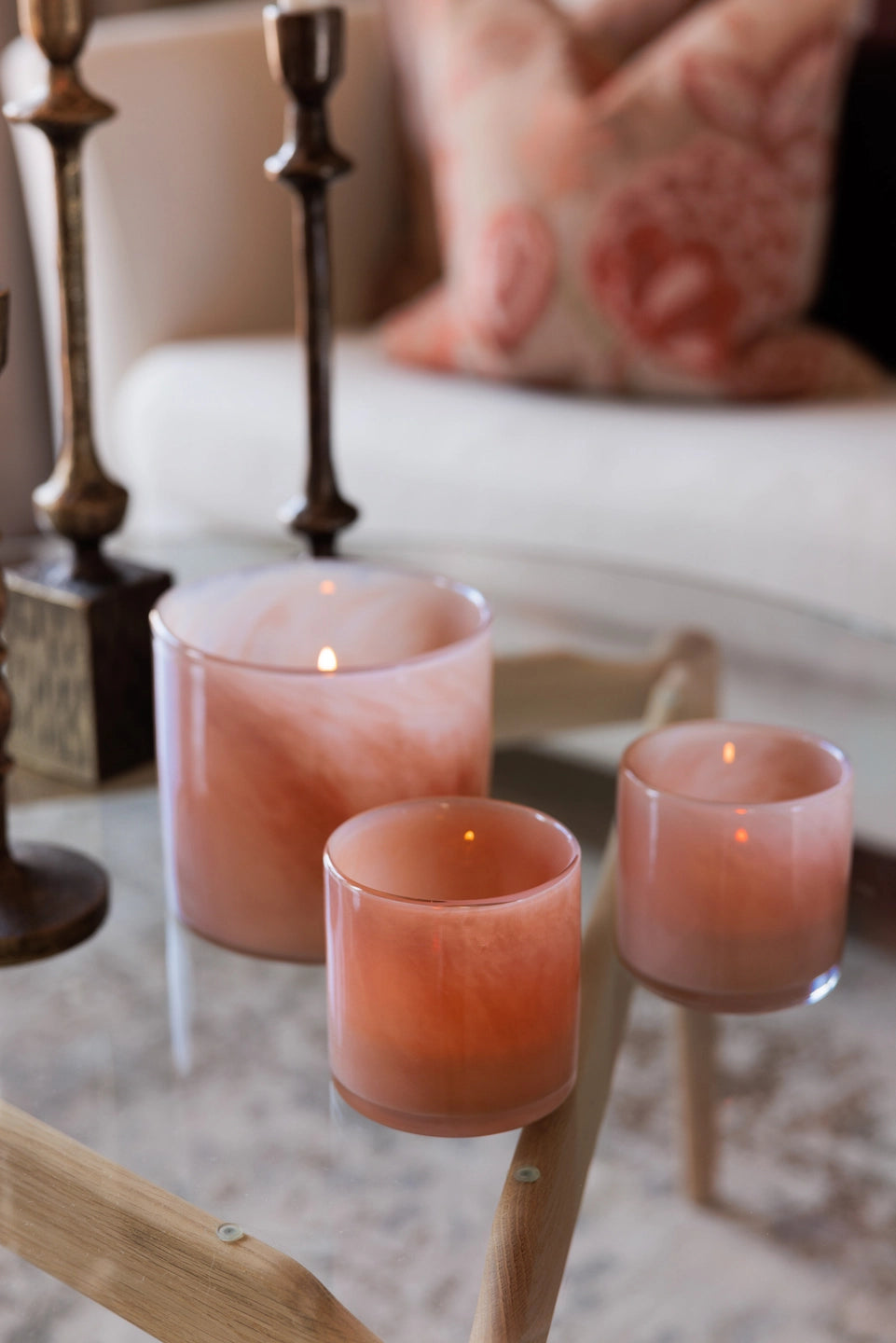Telysholder i farget glass i en vakker pudderrosa farge. Pigmentet i glasset er lett ujevnt fordelt, noe som gir et vakkert spill i fargen mellom de mer og mindre gjennomskinnelige områdene. Fordi glasset er gjennomfarget, kan lysholderen også brukes som vase eller potteskjuler.